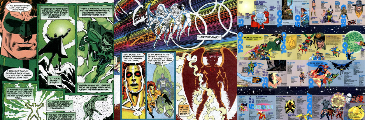 In an effort to address some of these lingering issues, and further incorporate some of the popular Pre-Crisis characters and ideas into modern continuity, DC capitalised on Green Lantern Hal Jordan’s recent descent into madness, genocide, and villainy with another massive inter-company event. Zero Hour: Crisis in Time (Jurgens, et al, 1994) saw Jordan, as Parallax, absorbing vast amounts of cosmic and chronal energy with which he planned to remake reality and undo all the wrongs that had happened since the death of Superman. Due to Parallax messing about with time, many continuity changes were forced into DC canon; Superman was explicitly described as having debuted “ten years ago”, the Legion of Superheroes were (finally) completely rebooted, Batman’s killer became anonymous and at large, and all conflicting versions of Carter Hall/Hawkman were consolidated into one singular character since DC never really bothered to reboot his origin story following the original Crisis. With the bulk of Zero Hour’s five-issue run being made up primarily of exposition from Richard Rider/Waverider or Parallax, many of the consequences of Parallax’s actions were told in DC’s individual comics. In the end, despite the insanity of time literally being ripped apart around them, the heroes were able to thwart Parallax’s efforts and allow time and reality to unfold naturally, albeit with many changes. Zero Hour resulted in many changes to popular DC characters; Guy Gardner suddenly became a shape-changing Vuldarian, many of the Justice Society were rapidly aged or killed off, Connor Hawke was introduced as the new Green Arrow, and Arthur Curry/Aquaman now sported an unkempt look and a harpoon for a hand.