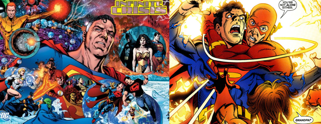 However, Zero Hour actually created more problems than it solved; Hawkman’s origins were no more clearer now than they had been before. Eventually, The Return of Hawkman (Goyer, et al, 2002) returned the character to mainstream continuity, explaining that the character was locked in a constant cycle of death and rebirth. Additionally, DC sought to address their ongoing continuity issues (and tell out of continuity stories) through the concept of Hypertime, which, much like the previous infinite Earths concept, allowed for alternative versions of events to be played out. Eventually, and with the twentieth anniversary of the original Crisis looming, DC decided to commission their biggest inter-company crossover yet. Consisting of multiple ongoing stories all building up to its central narrative, Infinite Crisis (John, et al, 2006) aimed to not only re-establish the multiverse concept and finally tie-up all of the lingering continuity issues left in the wake of Crisis on Infinite Earths and Zero Hour, but also move the company away from the dark stories that had dominated during the mid-nineties. After numerous event-scale storylines, the DC trinity (Batman, Superman, and Wonder Woman) were divided and the DC universe was in turmoil. Frustrated with how bad Earth heroes have let things get and perceiving that they have squandered their new world, Kal-L, Alexander Luthor, and Superboy-Prime break free from their pocket dimension and set about cannibalising the Anti-Monitor’s corpse to re-establish the multiverse and return peace and order to the universe. However, it turns out that seeing his world destroyed and having his youth ripped away from him, coupled with living in isolation and the machinations of Alexander Luthor, have driven Superboy-Prime mad. While Alexander straps various heroes and villains to an inter-dimensional tuning fork, Superboy-Prime goes on an accidental murder spree before Bart Allen/Kid Flash forces him into the Speed Force itself, at the cost of Wally West and his family.