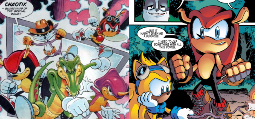 Mighty, meanwhile, is slightly simpler; like Knuckles, he would have bashed through walls and boulders by running or jumping into them and, if possible, incorporated his dropping bash to smash through boulders beneath him. Mighty could also have kept his wall jumping mechanic from Knuckles’ Chaotix, which could have been implemented in ways that compensated for the loss of Tails’ flight, and potentially even have deflected all projectiles when rolled into a ball. In later 3D titles, Mighty could have kept the physical attacks used by Knuckles and, eventually, have evolved into a brawling/hack-and-slash hybrid similar to that seen in the Werehog in Sonic Unleashed (Sonic Team, 2008). Remember that, in both cases, Mighty and Ray would have exactly the same personalities and character traits as Knuckles and Tails, respectively, so much of the characterisation these two have been given in the comics and Sonic Mania Adventures would instead be supplanted with those seen in Tails and Knuckles. Just as it is easy to imagine Tails and Knuckles adopting some of the mechanics now assigned to Sonic (the bounce, the stomp, the wall jumping, some of the other Wisp abilities), so too can I easily see these being adopted by Ray and Mighty. Ultimately, however, this alternative timeline featuring Sonic, Ray, and Mighty as the Triple Threat would have meant the loss of two of the franchise’s more visually striking and engaging characters.
