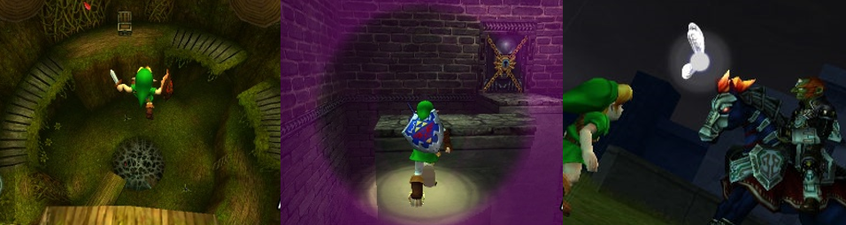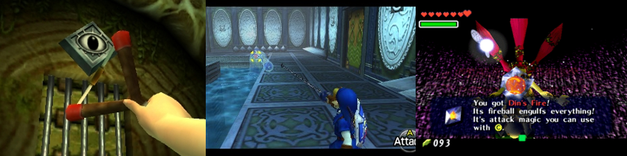 One of the game’s biggest gimmicks is the titular ocarina; by touching the bottom screen, players can play magical tunes to talk to Link’s childhood friend, Saria, for more tips, warp across Hyrule, open new paths, or even make blocks appear or disappear. As you explore and talk to NPCs, such as the mysterious Shiek, you’ll learn more songs that allow you to change the environment, such as turning day to night or causing rain. Link’s quest is split into two distinct parts: first, as a child, he needs to locate the three Spiritual Stones. Then, after awakening as an adult, he can explore new regions of Hyrule in search of five Sage Medallions, all of which are necessary to first access the Temple of Time and then confront Ganon in the desolate future. Link will need to both fight, sneak, and talk his way to these goals; one of your first objectives when you leave Kokiri Forest is to sneak into Zelda’s Castle, a task accomplished only by staying out of sight of her inept guards. When in Kokiri Forest, Link will have to bypass a rolling boulder to get the Kokiri Sword and slap down some Rupees for his first rudimentary shield, before putting these weapons to the test to try and save the Great Deku Tree. Indeed, the first three dungeons lay the ground work for the puzzles and actions you will need to overcome throughout the game; you’ll be lighting Deku Sticks on fire to burn away cob webs, climbing walls and plunging to new levels, hopping to moving platforms, hitting, standing on, or weighing down switches, and defeating all enemies to acquire keys, maps, and compasses all with the goal of acquiring the dungeon’s weapon and defeating its boss. Young Link is eased into all this quite well; the challenge increases with each dungeon he enters, putting new obstacles such as a raging volcano, destructible walls, a hungry fish deity, and a stubborn Zora princess in his path. Although his options are limited as a child, Young Link is key to forging relationships in the future; you’ll only tame the wild Epona by visiting Lon Lon Ranch as a child, for example, navigating the confusing maze of the Lost Woods is far easier as a child, and it’s only by returning to the past that Link can complete a brain-melting paradox, venture into a spooky well, and acquire the Lens of Truth.