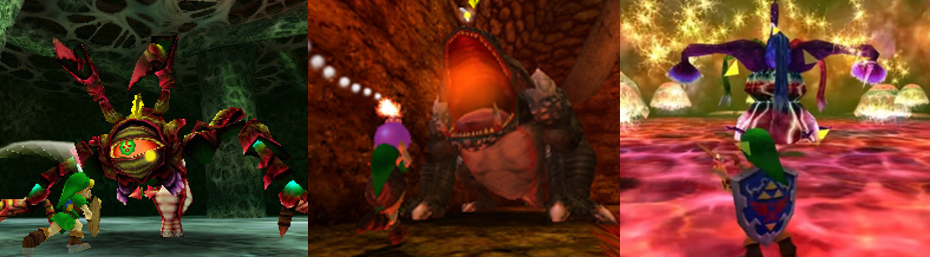 Young Link will have to defeat three bosses to obtain the Spiritual Stones which, like the dungeons themselves, set a precedent for the game as they are best fought with the weapons you obtain in their lair. First up is Queen Gohma, a massive, slobbering spider-like creature that scuttles about on the ceiling, drops Gohma Larva to attack you, and lurches or drops on you. Fortunately, you can shoot a Deku Seed at her big, glaring eye to stun her, easily allowing you to destroy her with a few sword swings. King Dodongo is a little tougher as he’s much bigger and rolls around an arena with lava in the middle. When he pauses to breath fire at you, you need to toss a bomb in his mouth to stun him for an attack, with the biggest issue here being avoiding his cannonball-like rolling. After chasing a Big Octo around a rotating spiked platform and slashing at its ass, you’ll battle Barinade within Lord Jabu-Jabu. This pulsating, electrical monstrosity protects itself with Giant Biri, which must be destroyed to expose its core, and blast of electricity from its artery-like appendages. Your best bet is to hang back with your guard up and continuously toss your boomerang to take care of Barinade’s defences, then leap in sword attacks when its stunned. Later, Young Link will need to venture to the Bottom of the Well to retrieve the Lens of Truth, which is guarded by the unsettling Dead Hand, which teleports in a burst of dust and holds you in place with a field of disembodied hands while it closes in to take a bite. Similarly, Young Link will battle an Iron Knuckle in the Spirit Temple, though this fight is both slightly easier and slightly harder than battling them as an adult. It’s easier because Young Link can completely hide under his Hylian Shield, but harder because his Kokiri Sword does way less damage; you also can’t get too close as the Iron Knuckles deals massive damage with its axe, though it can be tricked into destroying nearby columns to restore your health.