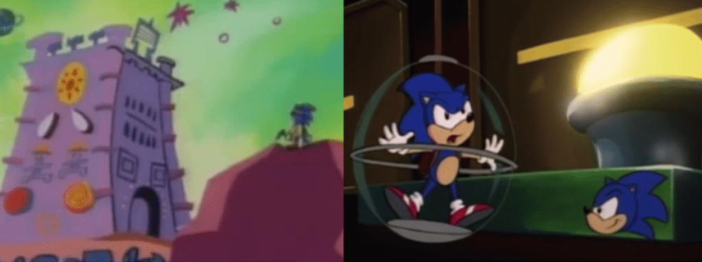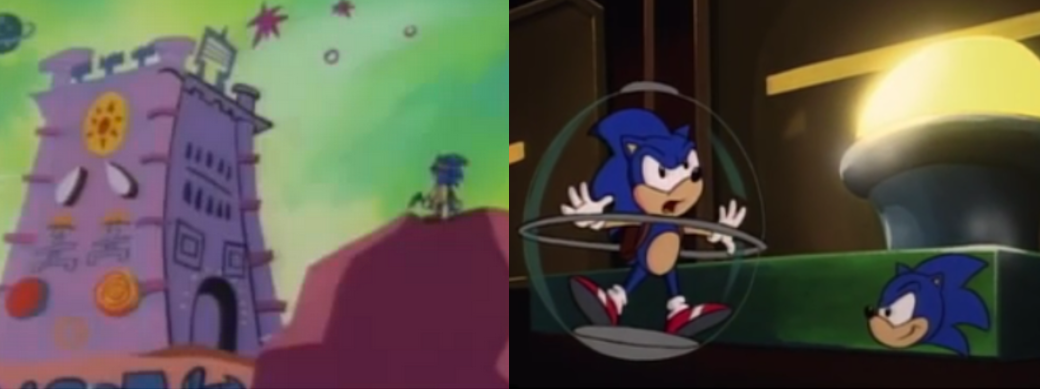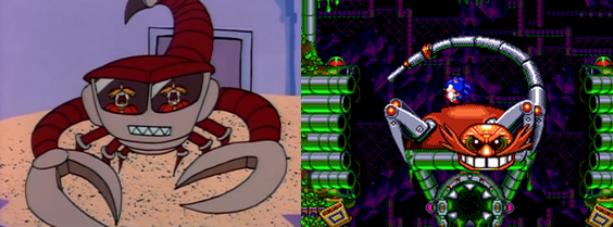 ‘Attack on Pinball Fortress’ (Butterworth, 1993) saw Sonic, Miles “Tails” Prower (Christopher Welch) join forces with Sergeant Doberman (Phil Hayes) and one of Adventures’ more amusing reoccurring characters, Wes Weasely (Michael Donovan), when Robotnik threatens Mobius with a gigantic Stupidity Ray housed within his Pinball Fortress. When the group infiltrates the Pinball Fortress, they are knocked about by giant flippers and into other gigantic recreations of cliché pinball machines before they encounter Boss Scorpion, a massive robotic scorpion that Robotnik uses to try and thwart the heroes. Obviously, this fails and it isn’t long before the robot is devoured by lava and Robotnik’s plot is thwarted. As an adaptation of Sonic Spinball, ‘Attack on Pinball Fortress’ is very bare-bones; it’s almost as if the writer, Bob Forward, was given a few pieces of concept art and nothing more as the episode has next to nothing to do with the videogame beyond the vague concept of a pinball-themed fortress and a giant scorpion. Yet, as basic an adaptation as ‘Attack on Pinball Fortress’ is, it’s got nothing on ‘Game Guy’ (Myrick, 1994), an episode of SatAM that sees Sonic trapped within a pinball-themed game right at the conclusion of the episode, which mostly concerns Sonic and Sally being at odds over the appearance of another Freedom Fighter, Ari (Dorian Harewood). Ari betrays Sonic but, when Robotnik nearly uses his giant pinball table to suck Sonic into the Void, he sacrifices his freedom to not only save Sonic but lead the Freedom Fighters towards other allies. Literally the only thing in ‘Game Guy’ that comes from Sonic Spinball is the giant pinball-themed trap that Robotnik nearly bests Sonic with, but then this was par for the course for SatAM, which was concerned more with environmental messages than adapting plots from the videogames.