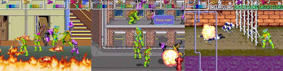 Teenage Mutant Ninja Turtles is a sidescrolling beat-‘em-up that supports up to four players; some arcade cabinets were apparently set up to accommodate just two, and to allow any player to select any character but, generally, cabinets were set up specifically for four players to play simultaneously. Each of the four Ninja Turtles is selectable and has specific strengths and weaknesses: Leonardo is the most well-rounded, Donatello is slower but has a longer reach, and both Raphael and Michelangelo have fast attacks but are limited in their range. Each character can perform a flying kick and a super attack by pressing the jump and attack buttons at the same time which, unlike other sidescrolling beat-‘em-ups of the time, doesn’t appear to drain your health. In addition, they can hurl their enemies around for extra damage but there’s no forward dash and very little in the way of intricate combos on offer here; it’s a simple, pure “go right and mash the attack button” beat-‘em-up, with the exception of one level, where the TMNT race around the streets on rocket-powered skateboards.