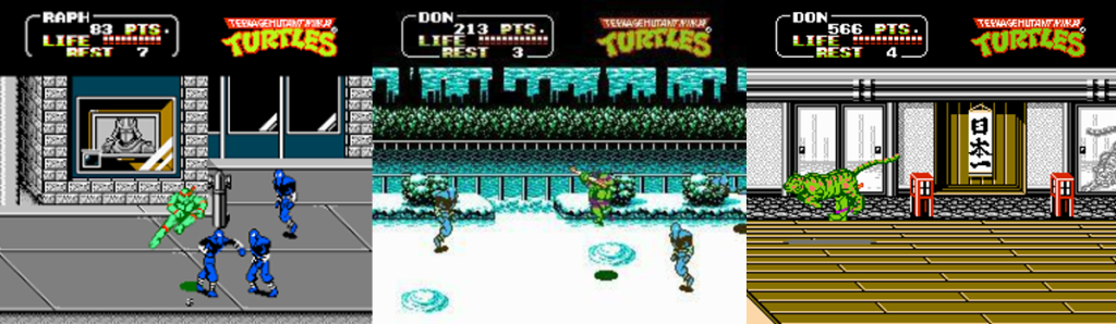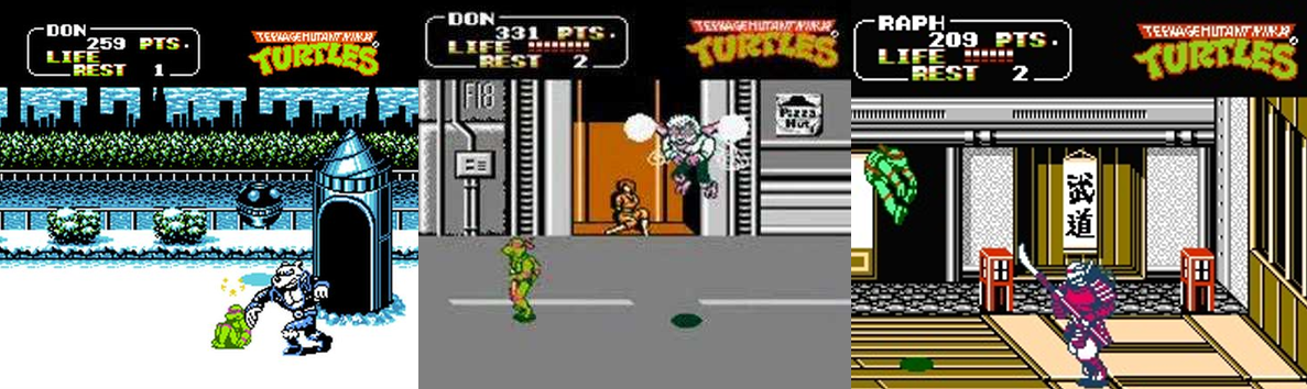 Many of the enemies and hazards featured in the arcade version reappear in the NES version, with some alterations and limitations; the Foot can still grab you from behind and Mousers will still bite your hand, but shaking them off is clunkier than before and Roadkill Rodneys now simply fire lasers. There is a new variant of the Foot that tosses dynamite at you, however, and the portraits of tigers randomly spring to life in the dojo stage; you’ll also encounter antagonistic snowmen that fire homing missiles at you in the snow-themed stage. All of the arcade game bosses return as well, but again with less dialogue and being far simpler; Rocksteady and Bebop simply blast at you and kick or punch you up close, for example, but you’ll still get (partially) roasted and blasted by Grindor and General Traag’s heavy ordinance. Two new stages means two new bosses, but there’s actually three new bosses in total as Baxter’s fly form replaces the duo of Bebop and Rocksteady at the end of the parking lot stage, hovering about and firing duel lasers from his antennae (or his wings, it’s hard to tell…) Anyway, Tora the polar bear awaits in the frozen New York City, though I never saw him do anything but wander around and punch at me, and the robotic bounty hunter/samurai, Shogun, battles you at the end of the dojo, swiping with his katana while his disembodied head flies about the place. The fight with Krang and the Shredder remain largely unchanged, except Krang’s sprite isn’t very intimidating and the Shredder can’t seem to one-hit kill you this time around; all enemies and bosses can also be defeated in one hit with God Mode activated as well.