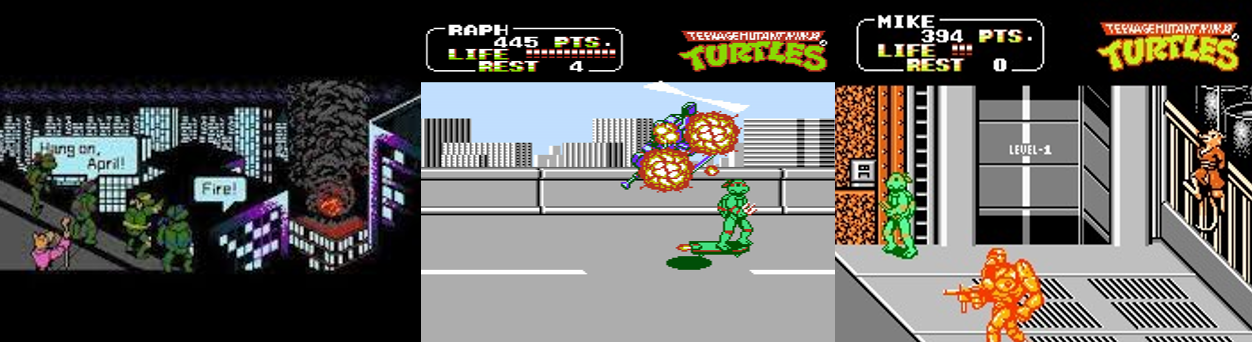 For the NES version of the game, much of the gameplay and combat remains intact and surprisingly faithful, especially considering the NES’s limited hardware. Naturally, you’re limited to two players at any one time, but you can still attack with X and jump with A, pulling of flying kicks and smacking the odd fire hydrant, parking meter, traffic cone, and explosive barrel to help thin out the enemies coming at you. The Foot Clan will still burst out from window sand jump out from the sewer, and you can still fall down the holes they leave behind, but the amount of onscreen enemies is severely limited compared to the arcade game; on the plus side, this makes crowd control a little easier and you’re rarely swamped with too many enemies at any one time. While a bit sluggish compared to the arcade title, the NES version performs far better than other similar 8-bit ports, like Double Dragon (Technōs Japan, 1988), though it helps that the Cowabunga Collection gives you the option to disable slowdown and sprite flickering. You’re still able to go diagonally down or fight on higher panes, too, as well as blast along on your rocket-powered skateboard; the NES version even includes two new stages, a snow-swept New York City and a Japanese dojo, each including new enemies, hazards (falling ice blocks and bamboo spikes), and bosses alongside additional cutscenes, which was a nice and unexpected touch.
