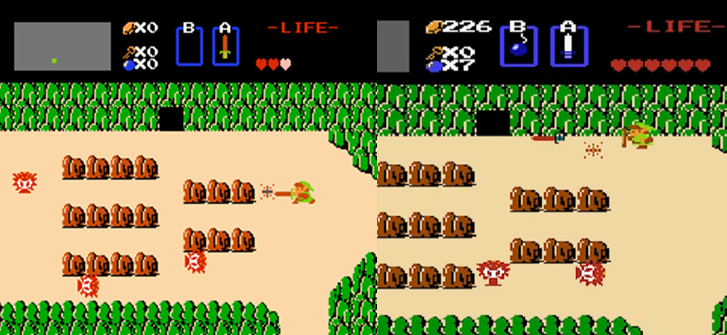 Link begins the game with three hearts’ worth of health which, very quickly proves to be far too little to get past the game’s tougher enemies and dungeons. Fortunately, every time you defeat a dungeon boss, you expand your maximum hearts by one and can find additional Heart Containers hidden on the overworld or for sale from certain merchants, which will increase it to twenty units. Certain weapons also have similar limitations; for the majority of the game, you can only carry six bombs at a time until stumbling across a merchant who will allow you to carry double that amount (…for a small fee), the only way to get arrows is to buy them, and your usage of the Red Candle is restricted. Thankfully, the Blue Candle and Magic Rod are not so restricted, allowing you to light up dark areas and deal damage to enemies (but watch out because the flame you conjure can also hurt you!)