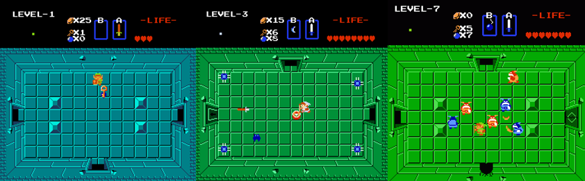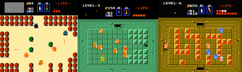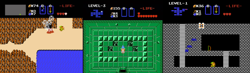 The Legend of Zelda is a very basic 2D adventure; like Super Mario Bros. and many videogames of that era, the graphics are extremely simplistic and, largely, require quite a bit of imagination and suspension of disbelief on the part of the player. Link is immediately and instantly recognisable against the game’s many different backgrounds and compared to the enemy sprites thanks to his green tunic and cute little sword and shield but, obviously, you’re not going to see many frames of animation or layers of detail in this game. Additionally, I found that the game struggled a bit when there were a lot of sprites onscreen and/or sounds playing at the same time; the iconic Zelda theme plays constantly on the overworld and, when Link is low of health, the game emits a constant beeping to inform you and enemies make little noises when they shoot at you or are destroyed and all of these sounds can blend into each other and the game slows down noticeably when a hoard of Lynels incessantly shoot projectiles at you.