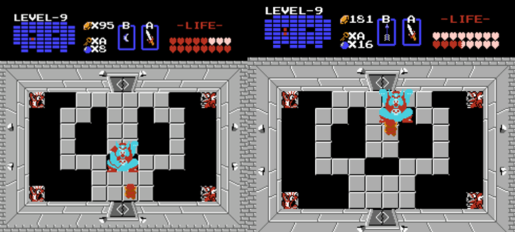 The game features nine dungeons to explore, which means nine bosses to contend with; make sure you familiarise yourself with each of these bosses, though, as you’ll encounter all of them on multiple occasions as sub-bosses in the game’s later dungeons. Technically, you can battle them in whatever order you like as long as you’re tough enough to survive the dungeon and their damage output but it’s best to try and take them on in sequential order to give yourself the best chance at success. This means that the first boss you fight should be Aquamentus, a horned dragon that spits out three projectiles that you must dodge between. This boss is fought in Level-1 and Level-7 and is made all the easier if you have the energy to use your sword beam or ammo enough to shoot arrows at it, which will make short work of it. The Dodongo, in comparison, is a pretty pathetic excuse for a boss; it lumbers around the screen doing little to nothing and is easily dispatched by placing bombs before its mouth. Later on, you’ll have to contend with three of these at once but, since they don’t make any effort to attack you, they’re easily the weakest of all the game’s bosses. Unfortunately, the same can’t be said for the Manhandla boss; this piranha-like bastard was the bane of my life since it popped up three times throughout the quest. It slowly bounces around the arena firing projectiles at you and is very tricky to hit thanks to the limited reach of Link’s depowered sword and Link’s restricted range of movement; it’s much faster and more efficient to use bombs to deal massive, successive damage to the Mandhandla but be wary as, the more parts of it you destroy, the faster its movements become.
