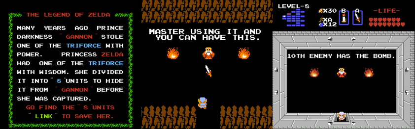 For an adventure game, The Legend of Zelda is extremely light on story and dialogue; the game’s story is told through some text when you wait around on the title screen but, beyond that, you’ll need to read the game’s instruction manual to learn more about the plot and the lore of Hyrule since the NPCs offer only cryptic clues and vague statements. Dialogue and character interaction is practically non-existent in The Legend of Zelda, which I find a bit surprising given how prominent it would become in the series and how heavy it featured in more traditional role-playing games (RPGs) released around the same time, such as Final Fantasy (Square, 1987). However, given the amount of grammatical errors and incongruous dialogue contained within the first Zelda this is, perhaps, a good thing; it also means that the onus is on the player to explore every nook and cranny and to experiment with every weapon on every screen on the game to uncover secrets and new areas, placing an emphasis on exploration and player immersion rather than hand-holding.