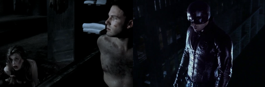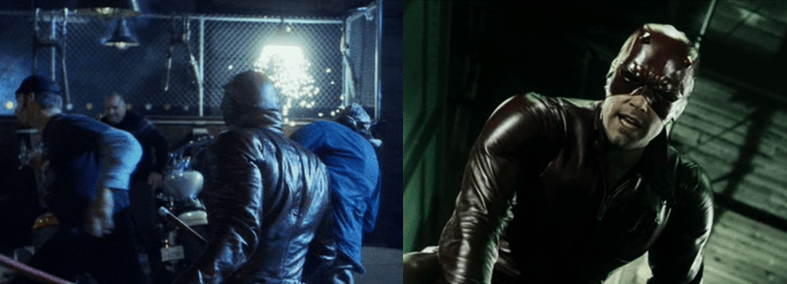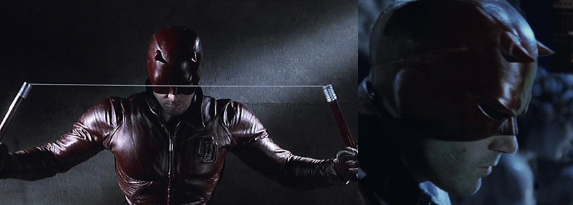 Another thing I always enjoyed about Daredevil was its dark and gritty aesthetic and the costume design; when taking to the streets as Daredevil, Murdock dons a thick, uncomfortable-looking but super bad-ass leather outfit that is a fantastic blood-red and is one of the few live-action superhero suits to actually use lens over the eyes. The practicality of this suit might be in question but it sure looks awesome (…when it isn’t rendered in shitty CGI), though I do find myself questioning how Matt was able to make it and the many duplicates hanging in his Devil-Cave. Matt also, of course, wields his multi-purpose cane (seriously, it’s a baton, nunchaku, a grappling hook, and even an axe!) but I find it hard to believe he could do both to such a high standard and exactly how does Matt manage to change into Daredevil in the middle of the city? There’s no way he’s wearing that suit under his clothes and he can’t be that close to his apartment all the time so either it’s a convenience for the sake of keeping the film’s frenetic pace going or Matt has stashed spare costumes all over the city!