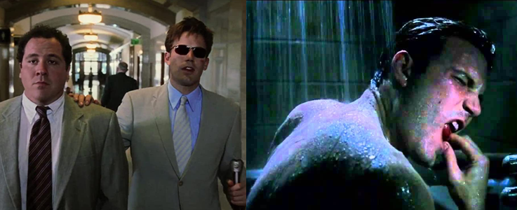 Tragically, Matt hears it all and is absolutely heartbroken when he comes across his father’s beaten and bloody body. He resolves to keep his promise to his father to help those that others wouldn’t and seek justice one way or another, with the film glossing over his time in college and law school and jumping ahead several years to find him fully grown into Ben Affleck. The older Murdock is a haunted, heavily conflicted individual; in order to block out the constant barrage of noises, he sleeps in a sensory deprivation tank and regularly chews a number of pills and painkillers to dull the constant pain from the many wounds he has suffered in his nightly jaunts. The effects of his double life can be immediately seen not only in his weary expression but also the multitude of scars, bruises, and injuries his body exhibits; though Matt’s abilities make him faster and stronger than the average man, he’s still human and we constantly see him suffering blows and injuries during his activities as Daredevil, taking hard shots to the ribs and even losing a tooth during the film’s first big action scene. I’m no fan of Affleck (largely because of the way he crapped all over this movie after professing to be such a big fan of the comics during its marketing) but he’s actually really great as Murdock; the special contact lenses he wears are only a small part of selling him as a blind man as Affleck assumes a slightly skewed posture and thousand-yard stare, always positioning himself in such a way that you can tell he’s lacking his sight. Additionally, Murdock uses Braille to identify his belongings, and even folds his notes in certain ways to recognise them (though it’s not entirely clear if he needs to do this, since we know he doesn’t, or if it’s all part of playing up his persona as a simple blind man), all of which go a long way to showcasing how a blind man might life his life.