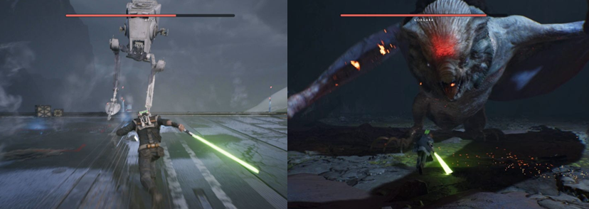 Bosses are a bit of a mixed bag, to be honest. You’ll have to contend with a number of large ships and creatures but some are more like underwhelming mini bosses; an attack ship blasts at you at the beginning of the game and forces you to dash between cover to avoid being blasted to pieces and, later, you’ll trade shots with a shuttlecraft while piloting your AT-AT. You’ll also have to fight against All-Terrain Scout Transports (AT-STs) more than once but, unlike in most Star Wars games, these are stupidly easy to take down as you can reflect their blaster bolts, easily jump over or reflect back their electrical bombs, and just hack away at their legs or cockpit until they go down (but remember to kill the pilot afterwards or you’re likely to be shot in the back). On Dathomir, you’ll also have to fight a giant bat, the Gorgara, in the game’s most unique battle; this thing stamps around the arena to produce shockwaves and screeches at you as you attack its wings. It’s also stupidly persistent, cashing you up a wall as you frantically climb away, before you end up having to free fall through the air, cling on to it with LT, and smash it into a series of structures until it finally goes down.