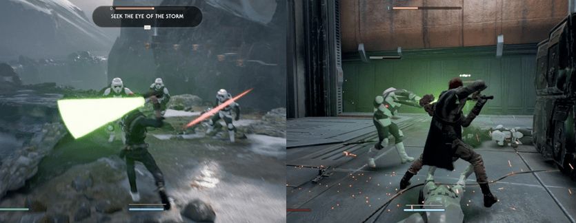 Cal has a range of abilities that are simple to learn but can take some time to master; he can jump with a press of the A button, evade with B, and sprint ahead by pressing in the left analogue stick. Although his Force abilities are quite light to begin with, they can be upgraded with Skill Points and you’ll be using the Force to push, pull, slow down, and freeze enemies and objects with the Right and Left Triggers. The Force also comes into play with your lightsaber attacks, allowing you to press Y to pull off stronger attacks in conjunction with mashing X as long as your Force Meter is full. Similar to the Force Unleashed games, lightsaber combat is pretty simple, for the most part; you simply hit X to unleash a number of combos and mix your attacks up with Force manoeuvres and evades to avoid taking damage and deliver a swift kick or counterattack. Key to lightsaber combat is the game’s block and parry system; you can hold down the Left Bumper to automatically block incoming attacks but, with a well-timed press of LB, you’ll reflect blaster bolts back at your enemies and parry incoming melee attacks. This will leave your foe vulnerable and allow you to follow up with an attack of your own in a system that reminded me of the Batman: Arkham games (Rocksteady Studios/Various, 2009 to 2015) but it’s not quite the same in that, despite being attuned to the Force, there’s much less indication of when to parry and combat can get a bit hectic.