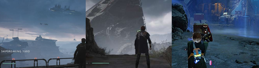 You can target an enemy by pressing in the right analogue stick but this only really helps in one-on-one situations; when groups of enemies attack you, you better be prepared to be attacked from behind and off-camera quite often even after acquiring a double-bladed lightsaber to help deal with multiple enemies. As you cut down enemies, you’ll build up your Force Meter but the only way to restore your health is to press up on the directional pad (D-Pad) to have your cute little droid companion, BD-1, administer you with a Stim Canister or find a special glowing meditation circle. Here, you can save your game, spend Skill Points, and choose to completely refill your health and Stim Canisters (though every enemy you’ve killed will respawn once you leave the circle). Like The Legend of Zelda: Breath of the Wild (Nintendo NPD, 2017), climbing is an important mechanic in Jedi: Fallen Order; however, unlike in that game, Cal isn’t hampered by a stamina meter and you can even set up the option to auto-climb climbable surfaces from the game’s settings. Anytime you see vines or serrated surfaces or a splash of white paint on a ledge, you can usually climb up it with LT, jumping up and across to cover a greater distance (though, thanks to the game’s janky camera and perspective, you’re just as likely to leap into the void). You can also run along walls, slide down…slides…and swing from ropes, chains, and vines, and you will also eventually learn to bring these to you with the Force to swing about like Peter Parker/Spider-Man but, again, the game’s camera and wonky physics often cause you to fly past your target or ragdoll down a bottomless pit. Jedi: Fallen Order takes Cal on a journey back and forth across a whole five planets (not counting the areas you can’t revisit from Cal’s ship, the Stinger Mantis). Once Cal leaves Bracca, the salvage planet he has been hiding out on, he travels to Zeffo and begins his quest to reconnect with the Force and recover a Jedi Holocron from a vault hidden on the planet. This quest takes him to recognisable worlds from the Star Wars saga, such as Dathomir and Kashyyyk, and worlds I’m unfamiliar with, each one with their own visual style and with secrets to uncover and enemies to fight.
