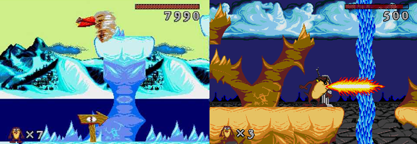 Taz’s journey is obstructed by a handful of enemies, such as bats, frogs, crabs, and anthropomorphic stone heads and man-eating plants that try to take a bite out of you. Your most persistent and annoying obstacle (apart from the controls) will be the abundance of instant death traps and hazards such as pistols, fans, jets of flame, and bombs that dog you at every turn. In Iceland, you’ll also want to avoid landing in the freezing water as you’ll be frozen into a block of ice that will slowly drain your health unless you mash buttons to escape.