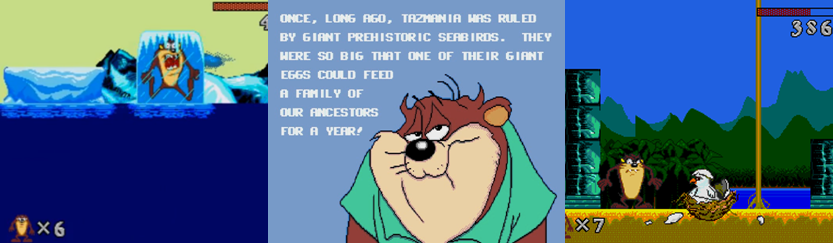 My absolute favourite Looney Tunes (1930 to present) character, the Tasmanian Devil (or simply “Taz”) first debuted in “Devil May Hare” (McKimson, 1954) as a dim-witted and voracious foil to Bugs Bunny (Mel Blanc). In the early- to mid-nineties, the Warner Bros. cartoons were undergoing something of a renaissance thanks to shows like Tiny Toon Adventures (1990 to 1992) and Animaniacs (1995 to 1998) and Taz became part of this resurgence in popularity when he graduated to his very own cartoon, Taz-Mania (1991 to 1995). To tie into this, several videogame adaptations of the show were produced; while the SNES version, which was more of a pseudo-3D endless runner, was unfavourably received, the Mega Drive title (which, like the others, was a traditional 2D sidescroller) was received very well. Since the Master System version (Technical Wave, 1992) was one of the first videogame cartridges I ever owned and one of my favourite action/platformers, I decided to pick up the Mega Drive version and see how the technically superior title holds up against others of its genre.