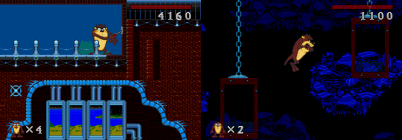 More than once, you’ll be tasked with jumping from log to log to cross some rapids; thankfully, you won’t instantly die if you fall or land in the water but you will be bounced out at the cost of some health. These aren’t particularly difficult sections but they become more troublesome when you have to move Taz up and down to the foreground and background, which makes positioning his exact landing point difficult to judge, and when you have to struggle upstream and avoid flying over the edge of a waterfall. By far the most frustrating and unfair section of the game, though, is when you must jump into a runaway mine cart; you can speed up and slow down by pressing left or right and press A to raise the cart up and avoid crashing headfirst into a bumper, but you also have to be careful not to collide with the ceiling, enemies, or to fall off the broken tracks. One mistake and you instantly lose a life, which is ridiculously unreasonable and makes the presence of a life bar almost completely redundant.