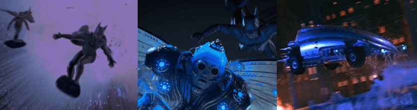 Each of the film’s action sequences is like some kind of chaotic acid trip! Take the opening sequence, for example: Batman and Robin intercept Mr. Freeze at the Gotham Museum, contending with “the hockey team from hell”, performing all manner of physics-defying stunts and tricks, and conveniently sporting ice skates in their boots! Mr. Freeze freezes a dinosaur statue to cover his escape in a rocket that fires from his absolutely ridiculous Freezemobile! Batman follows and is left to freeze to death in space before Robin rescues him and they surf through the night sky on doors of the rockets to pursue Freeze, who sprouts wings from his armour! Having said that, though, the Batmobile/Redbird chase against the Freezemobile and Mr. Freeze’s goons is pretty good but would be even better if they weren’t racing across the building, iron biceps of a gigantic statue!