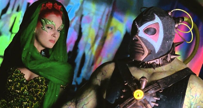 So smitten by her allure are they that they begin a very public, very childish bidding war for her services, resulting in one of the most cringe-worthy moments in not just a Batman movie but all of cinema…yet, in a bubble that sees this as an extension of the bright, campy sixties Batman, you can see this as a fun (as in “daft”) scene. When Mr. Freeze crashes the party, Ivy is immediately in awe of his strength, conviction, and direct approach; when her pheromones have no influence on him, she becomes even more interested in him as a potential partner and, just as Robin is infatuated by her, she comes to be enamoured with Freeze. To that end, she and Bane break Freeze out of the ridiculously elaborate Arkham Asylum (literally a gothic castle on a storm-swept island!) and, when he continually shoots down her advances, she kills off his wife out of jealousy and to sway him into an alliance to freeze first Gotham, and then the world, and have her animal/plant hybrids rule what’s left alongside them. Far from the intellectual mastermind of the comics, Bane is a hulking, mindless brute who follows Ivy’s commands simply…because (she’s never shown using her pheromones on him so it’s unclear exactly why he submits to her). As in many interpretations, Venom is both his strength and weakness, making him simultaneously superhuman but also reducing him to a quivering, helpless wreck when his tubes are severed. He exists simply because Bane was popular at the time thanks to the influential Knightfall storyline (Dixon, et al, 1993 to 1994) but could easily have been any other Bat-brute; I’m thinking Waylon Jones/Killer Croc would have been a far better fit.