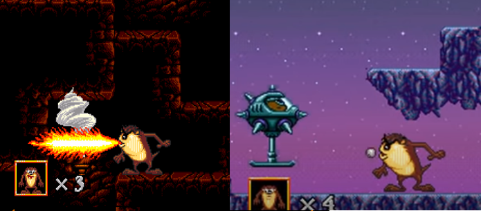 Taz can still breathe fire but, this time around, he has to gobble a can of gasoline rather than eating chili peppers. He can also eat boxes of rocks and spit a limited number of rocks at enemies as well, which is useful for taking out goofy aliens from afar and these projectile-based attacks are the only way of defeating some enemies, though there is no longer an invincibility star this time around.