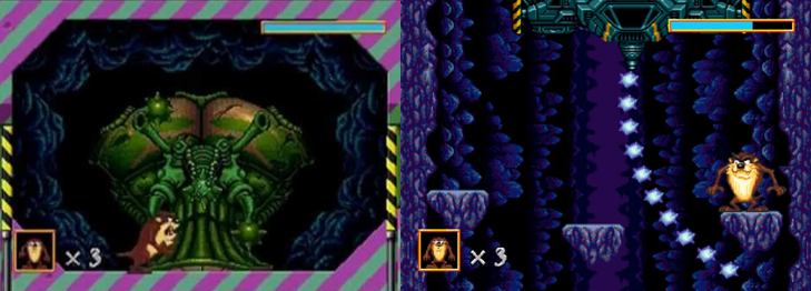 It’s all very surreal and this is reflected in the game’s bosses, which are much bigger and require a bit more that just spinning into (and jumping on to) them this time around. The first boss is a massive alien elephant thing that swings its trunk at you in a clockwise and anti-clockwise motion and spits spiked balls into the arena. Thankfully, as I mentioned, Taz’s spin will now carry him along walls and ceilings, which allows you to avoid damage and ricochet into the creature’s antenna-like eyes when they briefly appear in order to damage it. The second boss is a giant drilling machine which attacks you in free fall. Using small and otherwise precarious platforms, you must dodge its laser-like whip and missile attacks and spin into the pilot when he pops out from the cockpit. Thankfully, if you fall from your platform, the battle simply continues and I strongly recommend landing on a bigger platform to give yourself more freedom of movement.