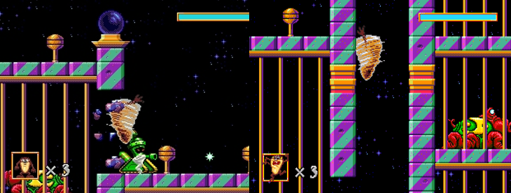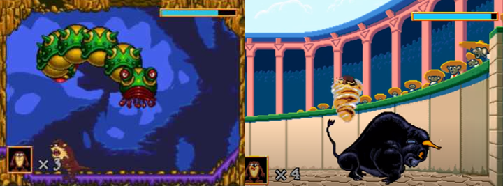 On Planet X, you’ll battle a gigantic worm-like creature than bursts out from the walls of the arena but sports a big, flashing weak spot on its rear end. Spin into this and you’ll destroy each segment of the worm, making it faster and more aggressive as the fight goes on until only the head remains for the final blow. Things take a bit of a turn for the worst in Mexico, however, where you’ll battle the posturing Toro the Bull; Toro charges at you in a rage and will send you flying into the air with its horns before stopping and posing but don’t think that this is your window to attack! Instead, you have to stand in place while Toro charges his attack and then dash away from him and jump over him right at the last minute so that he runs head-first into the walls of the arena, which can be really difficult to do as he moves very quickly and tends to simply stop right before the wall.