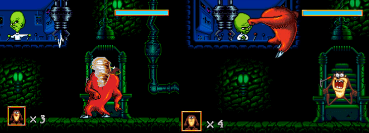 Easily the most confusing and annoying boss comes at the end of the Haunted Castle, however. Here, you are charged at and punched by the big red furry monster Gossamer while a mad scientist blasts at you with laser bolts. Gossamer is completely invulnerable except for in the eyes; you must spin into its eyes a few times until it’s stunned and, hopefully, get it to collapse into one of the seats in the background. Once it’s sat down, dash over to the other seat and pull the lever and you’ll swap bodies with Gossamer, which will allow you to destroy the laser device and end this perplexing boss battle.