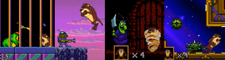 Another area where Escape from Mars out-does Taz-Mania is in the variety and appeal of its enemies; while no characters from Taz’s cartoon appear apart from Taz himself, the game makes up for this by swapping out bats and weird rock monsters for a handful of crazy alien foes who explode in a swirl of smoke when hit with Taz’s spin.