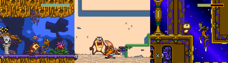 Taz in Escape from Mars takes the charming, cartoony aesthetic from the previous game and expands upon it in every way. Taz’s sprite remains mostly the same except for a new coat of paint, which is a little disappointing as his jump is still lacking in frames and the developers didn’t even program him a new idle animation. They seem to have tried to make up for this by expanding and shrinking him, which is pretty neat, but these mechanics aren’t seen very often (I only grew big once in the entire game) so it would have been nice to see Taz’s sprites and range of motion expanded a bit more alongside his speed and abilities.