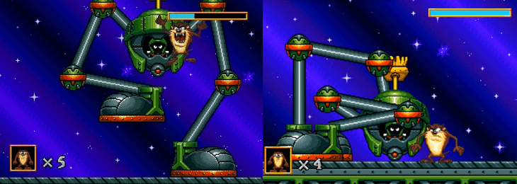 The finale sees you taking on Marvin the Martian in a giant mech made in his image. The mech stamps around the arena and tries to kick at you but it also likes to stop and dance about with one of its massive feet. This is one of the trickier bosses as you must quickly jump up the platforms on its feet and legs and then launch a spin attack at the yellow plume on the “head” of the mech in order to damage it. Do this enough times and Marvin’s mech will collapse in a heap and Taz will finally be able to return to his peaceful life back in Tasmania.