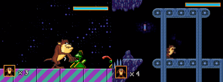 As before Taz can pick up and use objects and use levers and other mechanisms with A, spin like a tornado with B, and jump with C. Unlike in the last game, Taz cannot defeat enemies or damage bosses by jumping on them but his spin attack is much faster and more useful this time around as you can use it to bounce Taz up narrow walls to reach higher areas. You can also hold down the B button to race across certain surfaces, including walls and ceilings, and to break through certain walls to avoid attacks and progress further.
