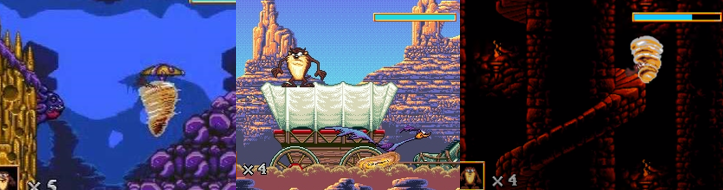 Not only is there more depth to the game’s environments, there are more interesting gimmicks in place, such as moving and temporary platforms, floating platforms, using mushrooms to ascend around spiked mazes, and jumping from cow to cow in the Mexican desert to say nothing of encountering more Looney Tunes characters, such as the Roadrunner and Yosemite Sam. You can also use Taz’s spin to go up and down spiral staircases in the Haunted Castle, traverse environments on floating cubes, and there are even some gravity-based mechanics at work in Marvin’s House. Taz can even enter an alien device and be duplicated a few times in this level and you’ll need to hop onto the doppelgänger’s head to reach higher areas. Having said that, though, the game manages to balance out all the improvements it makes on its predecessor with some annoying enemy and hazard placements (there are now two types of bombs, for example, that Taz will happily gobble down and get blown up for his troubles); some enemies, like the aforementioned Yosemite Sam, can’t be defeated and will attack you relentlessly. It can also be frustrating to enter the background through doorways only to instantly get stuck or become lost as you either can’t see where you need to go or there is nowhere to go, making the mechanic a bit pointless. By far the most annoying gimmick in the game are the lasers that instantly turn you to ash in Marvin’s House; you’ll have to desperately float and flail about using the gravity mechanics and attacking the laser generators from precariously small platforms in the hopes of reaching (and eating) the coveted exit sign.
