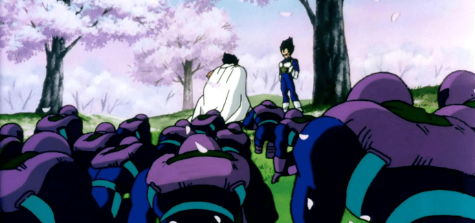 Goku is restless not only because he’s bored and hungry but also because he’s missing out on a nice little picnic for his closest friends and family; in many ways, though, I envy Goku as he doesn’t have to put up with Krillin’s (Strait) God-awful singing, which is so bad that Vegeta looks ready to kill him. Thankfully, this ear-splitting screeching is interrupted by the arrival of Paragus, who drops down in a massive spaceship full of alien soldiers, all of whom immediately bow and pay reverence to Vegeta. While Vegeta isn’t massively impressed with Paragus’s desires to rebuild the Saiyan army, his curiosity is piqued when Paragus mentions that the “Legendary Super Saiyan” is wreaking havoc across the galaxy. Sure that it’s some kind of trick, Future Trunks (Vale) moves to stop his father from leaving and stows away on the spaceship with Krillin, Master Roshi (McFarland), and Oolong (Bradford Jackson), of all people. These latter two character exist simply to act as our comedy relief for the remainder of the film, which is generally their role in most of the Dragon Ball movies and anime but it’s somewhat out of place here; Roshi’s intoxicated state is good for a few laughs but I can’t help but feel like Krillin could have handled the awkward comedy relief parts perfectly well all by himself.