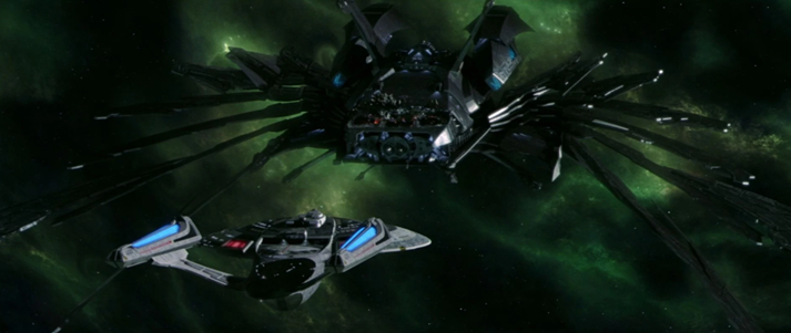 The Scimitar is a forboding and intimidating warship that dwarfs the Enterprise-E.