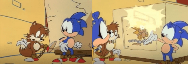 Yeah, it’s basically the plot of Back to the Future (Zemeckis, 1985); however, thanks to the convenient fact that Tails not only remains in the past but also still remembers someone who never existed, being erased from existence is only a minor inconvenience for Sonic as Tails simply forces Masonic and Penelope to meet, instantly returning Sonic to life. Rather than actually removing the infallible Sonic from the plot and having Tails team up with Masonic in an effort to undo their actions, what should be a major plot point is almost immediately undone and, once again, Tails is rendered to a mere sidekick. Similarly, when the Pharaoh of Mobigypt (Chalk) refuses to give up the location of the Chaos Emerald, Robotnik declares himself Pharaoh and forces Sonic, Tails, and Masonic to spend the next twenty or thirty years building pyramids. Oddly, it’s actually easier for Sonic to repeat the same time-bending trick he pulled in “Black Bot the Pirate” and carve a hieroglyphic message for Professor Caininestein to conjure up a saw to cut through their piddling little chains that it is for him to simply buzz saw through them but I guess that wouldn’t be anywhere near as impressive as having Sonic “Mary Stu” his way out of another hopeless situation.