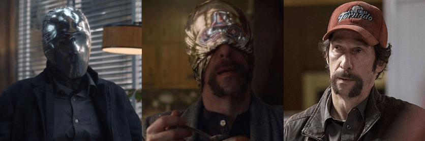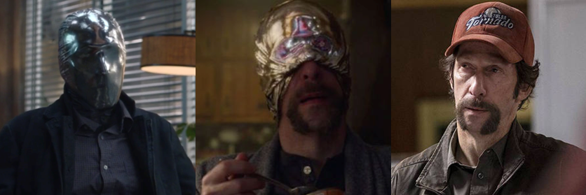 This naturally means that she ruffles a lot of feathers once she is assigned to Judd’s murder case, believing it to have been the result of vigilante action, and causes her to clash with those in the Tulsa police department, such as Wade Tillman/Looking Glass (Nelson). Looking Glass, who adopts many of Rorschach’s characteristics (his blunt, monotone voice, his stature and body language, his paranoid over-preparedness, and even a similar mask), is a highly perceptive and analytical character who is able to tell what someone is really thinking and feeling (or whether they are lying) through his highly tuned reading of body language. After suffering some of the squid’s violent psychic impact, Looking Glass constantly shields his head and face behind a reflective material to keep himself sane and free from nightmares, meaning he is much more comfortable hiding behind his masked identity. However, while he is the closest thing the series has to an actual Rorschach-like character, he is fundamental different from Rorschach in many ways and is, in a lot of ways, Rorschach’s opposite (Looking Glass, for example, lives in a house, has had various (often disastrous) relationships with women, regularly unmasks to reveal, at least, his face, and is a devoted member of the establishment rather than being anti-authority and uncompromising).