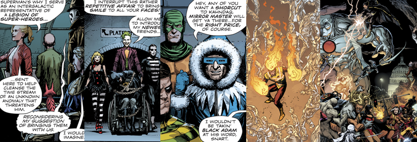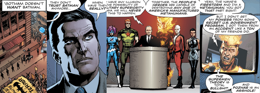 The group uses a refitted version of Daniel Dreiberg/Nite Owl’s (sadly, once again, entirely absent from the tale) Owlship to then follow Dr. Manhattan’s unique energy signature to the mainstream DC Universe just as their world is destroyed by nuclear war. However, life on Earth-0 isn’t exactly much better; riots and violent protests against Batman’s presence run rampant in Gotham City and the public’s perception of superheroes has soured thanks to the publication of the “Supermen Theory”, which uncomfortably pointed out that the vast majority of the world’s superheroes are white American men and suggested quite explicitly that the American government (clearly led by President Donald Trump) have manufactured their superheroes through a series of clandestine experiments and operations. The only superhero that the public and the world’s governments has any faith in is Clark Kent/Superman, who is still regarded as a worldwide icon and allowed to freely cross borders. The linchpin of the animosity towards superheroes is the outspoken and volatile Ronnie Raymond/Professor Martin Stein/Firestorm and, to compound matters, the Russian government (led by Vladimir Putin) forms their own team of metahumans to protect their borders, while Teth-Adam/Black Adam offers sanctuary to all metahumans, good and bad, in the sovereign nation of Kahndaq.