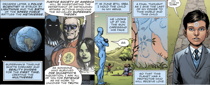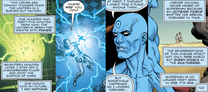 Speaking of Dr. Manhattan, he, too, gets another entire issue dedicated to him and his journey throughout the DC Universe. It’s basically exactly the same as issue four of Watchmen, with Jon spending a lot of time on Mars, ruminating about his origins and past with Janey Slater, and recapping the events of Watchmen. Although Jon appeared to have somewhat rediscovered his humanity at the end of Watchmen, to the point where he willingly went along with Veidt’s plan and even killed Rorschach to protect it, and his desire to reconnect with humanity was a big aspect of the TV show, in Doomsday Clock he’s basically exactly the same disconnected and emotionless demigod he was in the original graphic novel. He is despondent to discover that he feels just as out of place in a world of metahumans and magic as he did amongst mortals and takes to exploring and experimenting with the DC Universe’s fragile reality to keep himself from growing bored. Dr. Manhattan’s perception of time is both the same as in Watchmen (he can see the past, present, and future simultaneously but cannot see anything past his vision of Superman rushing at him) but different. I always assumed from Watchmen that Jon could only perceive time from his lifetime since he never visits the past beyond his lifetime in Watchmen but, in Doomsday Clock, he can freely walk between the past, present, and future of the entire DC canon, including a multitude of parallel worlds. Fascinated by the metaverse and the role Superman plays in this world, he purposely messes with time, killing Clark’s parents before their time and causing Alan Scott/Green Lantern to die, thus removing the Justice Society of America (JSA) from continuity, intervening in Flashpoint (Johns, et al, 2011), and basically creating the New 52 and Rebirth continuities through his actions.