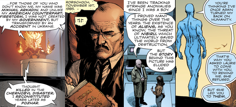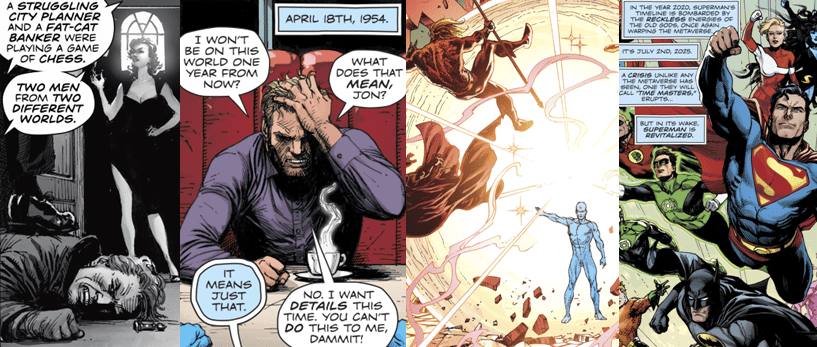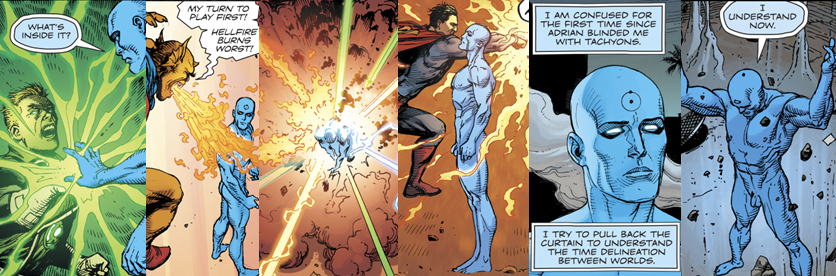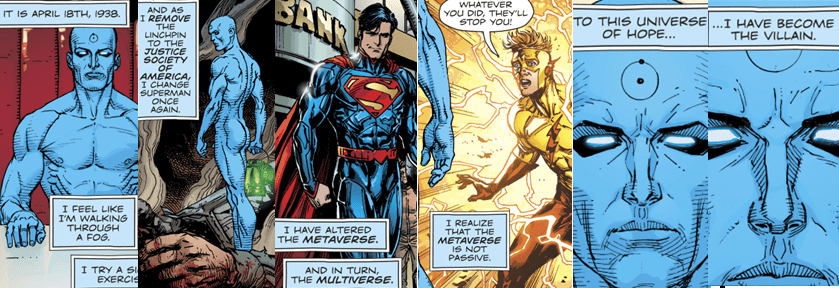 Amidst all of this is the mystery of Dr. Manhattan himself; at the end of Watchmen, Dr. Manhattan left to create some life of his own but, instead, was drawn to the DC Universe and discovers what is referred to as the “Metaverse”. The tumultuous nature of the DC Universe, which is not only populated by a wide variety of metahumans and magic but also subject to near-annual cosmic events and reality-shifting Crises, intrigues Dr. Manhattan, who begins to experiment with altering Earth-0’s history by subtly changing events in the past. This leads to the creation of multiple, widely different timelines and realities but, no matter what Dr. Manhattan does, Superman continues to emerge as the premier superhero of this world. Haunted by a vision of Superman flying at him in a rage and once again curious at his inability to see beyond this point, Dr. Manhattan observes the turbulent events unfolding around him with a morbid interest as he awaits to see if he destroys all reality or is himself destroyed by Superman.