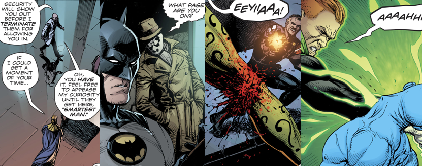 I mentioned before that Doomsday Clock is swamped with characters and it really is; a handful of the Watchmen characters obviously feature, including a brief appearance by the Comedian, who mainly features to try and kill Veidt for his attack on him at the beginning of Watchmen and to be a pain in the ass. Marionette and Mime, two completely original characters, feature extensively as Dr. Manhattan imbues their child with his powers in the finale to, presumably, become the Watchmen version of Superman. Additionally, a whole host of DC characters play a role in the story: Batman finally solves the puzzle of the mysterious bloodstained button but uncharacteristically chooses not to believe Reggie’s claims and has him locked up in Arkham, leaving him underequipped to intercede in the events of the story; Firestorm, here a volatile and immature character, escalates much of the tension regarding the perception of metahumans and the Supermen Theory when he is unable to control his powers; and, of course, the Joker makes an appearance but does little more than derail the main plot with an ultimately pointless side story.