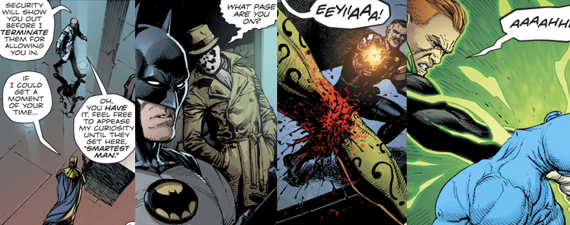 Similarly, the idea of Rorschach meeting Batman and Ozymandias meeting Lex Luthor sounds great…on paper but this isn’t the same Rorschach and, no matter how hard Reggie tries, he will never be that same character so it wouldn’t really work even if Batman didn’t just disregard him and lock him up in Arkham. Luthor is scornful towards Ozymandias and a potential team up between these two is also immediately cast aside, with Luthor mocking Veidt’s intelligence and plan as though Johns is poking fun at the very work he is so blatantly trying to homage and leech off of. The absence of Nite Owl and Silk Spectre equally hurts not just the story’s plot but also Doomsday Clock’s legitimacy as a Watchmen sequel; again, it feels less like the characters of Watchmen meeting the DC Universe and more like a handful of them dropped into the unexplainably chaotic DC Universe and struggling to make sense of it.