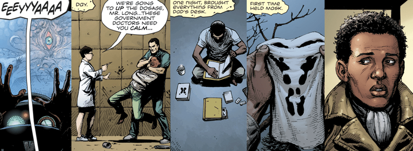 One of the things that disappointed me about the television show was the absence of Rorschach; I know we’re not supposed to like Rorschach but I don’t give a shit, he’s still the most interesting and compelling character in Watchmen. Although Kovacs is dead, his spirit and influence lives on in Doomsday Clock; not only was his tell-all journal instrumental in revealing Veidt’s deception, his crusade is taken up by Reggie Long, a confused and volatile young man traumatised by the effects of Veidt’s destructive squid. Like many exposed to the squid’s nightmarish psychic field, Reggie was driven to near insanity and spent a great deal of time confined to a mental hospital. There, he befriended former Minuteman Byron Lewis/Mothman, who becomes a friend and mentor to Reggie but ultimate contributes to Reggie assuming Rorschach’s mantle by purposely hiding the truth of Kovacs’ relationship with Reggie’s father.
