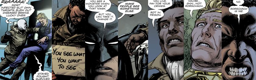 Believing that Rorschach and his father were friends and that Malcolm was able to reach and help Kovacs, Reggie is initially focused on killing Veidt for his actions but is convinced to aid him when Veidt claims to be dying and remorseful for his actions. Having read truncated versions of his father’s notes and Kovacs’ journal, Reggie assumes Rorschach’s costume and mannerisms and initially goes to Batman for help and finds himself imprisoned in Arkham Asylum for his trouble. Like in Watchmen, an entire issue is dedicated into delving into Reggie’s past and psychosis but he quickly gets lost in the shuffle as more and more characters and conflicts bog down the tale, even abandoning the mask and his crusade after Veidt’s lies are exposed. Ultimately, Alfred Pennyworth and Batman are able to convince Reggie to mask up and join the fight and Reggie even chooses to spare Veidt to see him brought to justice, claiming “Rorschach is me” but, while I appreciate the presence of a Rorschach, Reggie fails to be as compelling and instrumental as the real Rorschach and I think I would have preferred it if Dr. Manhattan had undone his actions or brought Kovacs forward in time as he did with the Comedian.