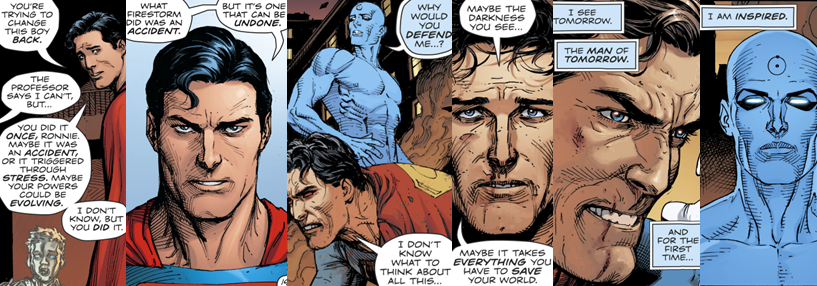 Accordingly, Superman is a central figure in Doomsday Clock; Dr. Manhattan is curious to see whether the Man of Steel kills him for his actions or whether he (as in Jon) destroys all reality and, still vehemently refusing to even try and go against the inevitability of fate, he refuses to intervene or to help Superman when he ends up battling against a horde of metahumans. As the only superhero who maintains the trust and respect of the public and world’s governments, Superman desperately tries to keep the peace, repair relations, and to help Firestorm after he accidentally turns a bunch of people to glass. However, he ends up making things worse and escalates the tensions between the world’s governments and metahumans, leading to an all-out war. Though disgusted at Dr. Manhattan’s refusal to get involved, and his part in causing not only the events of Doomsday Clock but also the tragedies of his life, Superman is ultimately able to inspire Jon into restoring the worlds and multi/metaverse to normal through his selfless nature.