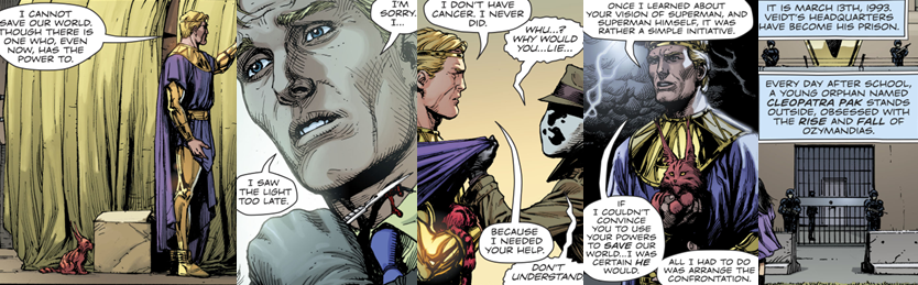 Veidt, however, is largely undeterred by the state of his world; though he sees a macabre irony in his elaborate plan falling apart and despairs at the world’s insistence on destroying itself, he immediately concocts another desperate plot to save the world by tracking Dr. Manhattan down and convincing him to intervene. As is his way, Veidt’s scheme involves deceit, lies, subterfuge, and his unmatched intelligence; smug as ever, Veidt easily manipulates Reggie Long into assisting him by faking that he (as in Veidt) has a tumour on his brain (and feigning remorse for his actions, which led to the death of Reggie’s parents) and has him recruit Marionette and Mime to their cause specifically because he knows that Dr. Manhattan once spared Marionette’s life in a past encounter. Upon arriving on Earth-0, Veidt attempts to recruit Lex Luthor and is met only with scorn and a surprise attack by the Comedian, whom Dr. Manhattan transported to Earth-0 moments before his death. Having read Kovacs’ journal, Batman is also less than impressed with Veidt’s actions and megalomania; Veidt, however, maintains that he did what he did in an attempt to save and unite a world on the brink of destruction and attacks his new scheme with just as much blind obsession. Thanks to a cute little clone of his lynx, Bubastis, the green lantern of Alan Scott, and the presence of another temporal anomaly, Imra Ardeen/Saturn Girl, Veidt is able to forcibly summon Dr. Manhattan, who not only refuses to help but also exposes Veidt’s lies. Veidt orchestrates a massive conflict between Superman and other metahumans in order to inspire Jon to finally intervene and, though this does result in the restoration of Earth-0, the Watchmen world, and the entire multi/metaverse, he ends up imprisoned at the conclusion of the story.