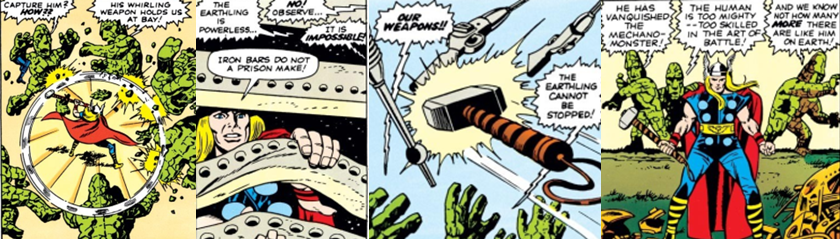 Before Blake can warn the world of the presence of the Stone Men, the aliens unleash a “three-dimensional picture” (basically a holographic projection) of a fearsome dragon to scare off incoming armed aircraft and shield themselves and their ship from reprisals and attacks with their advanced forcefield. Blake observes this with horror and, resolved to oppose the invading alien forces, he showcases one of his most iconic abilities: by swinging around Mjölnir as fast as possible, he can fly through the air and cover vast distances by hurling the hammer but holding on to the handle. It’s not quite flying and not quite the Hulk’s massive leaps but it’s something unique that no other hero can replicate. Astounded by Thor’s abilities, the Stone Men attempt to capture him but Thor is easily able to fend them off, break free of their prison, and use Mjölnir to disarm the aliens. In response, the Stone Men unleash their “Mechano-Monster”, a robot enforcer of theirs that is immediately and anti-climatically smashed to junk with one swing of Thor’s hammer. This is enough to scare off the Stone Men, who immediately flee alongside their entire fleet to avoid having to battle Thor and, possibly, more like him. The issue ends with the military dumbfounded as to what drove off the alien invaders and Blake resolving to head back to the United States with his newfound power.