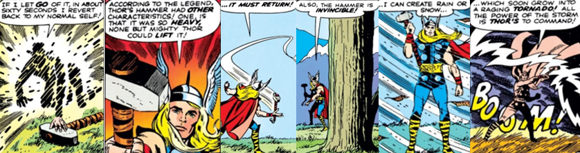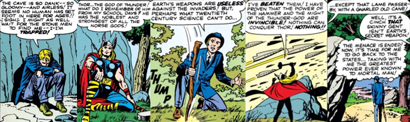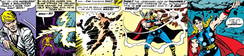 Blake finds refuge in a nearby cave but is disheartened to find that it’s a literal dead end; trapped, he begins to despair but is awestruck when a hidden stone wall suddenly opens and leads him to a secret chamber that houses a “gnarled wooden stick”. Ever the innovator, Blake attempts to use the cane as a lever but is unsuccessful and, in helpless anger, strikes the cane against the boulder which blocks his only viable exit. In a flash of blinding light, Blake and the cane are magically transformed into a heavily muscular, elaborately garbed form and an enchanted hammer, respectively. Overwhelmed by the power courses through his body, the figure observes the hammer’s iconic inscription (“Whosoever holds this hammer, if he be worthy, shall possess the power of… Thor”) and quickly realises that the hammer is Mjölnir, the weapon of the mythological God of Thunder, and that he is now Thor!