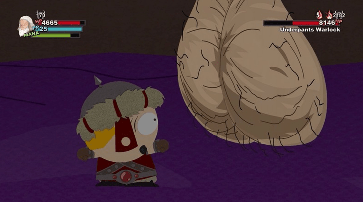 Of course, you’ll also have to take part in a number of more challenging boss battles throughout the game’s story. Stick of Truth’s boss battles involve a lot of variety compared to regular battles and have you performing slightly more complex actions, such as resisting the sleeping effects of Jimmy Valmer’s stuttering limericks, keeping the Hallway Monitor from calling your parents, and dodging the swinging testicles of your father as you battle the Gnome Warlock.