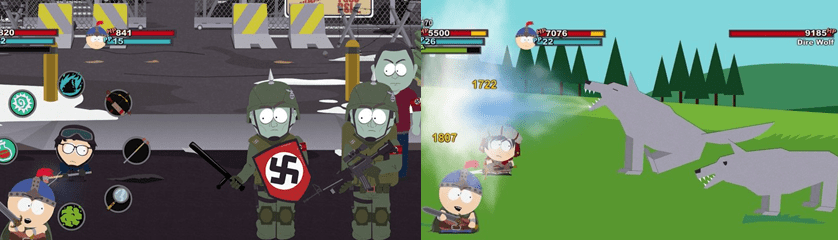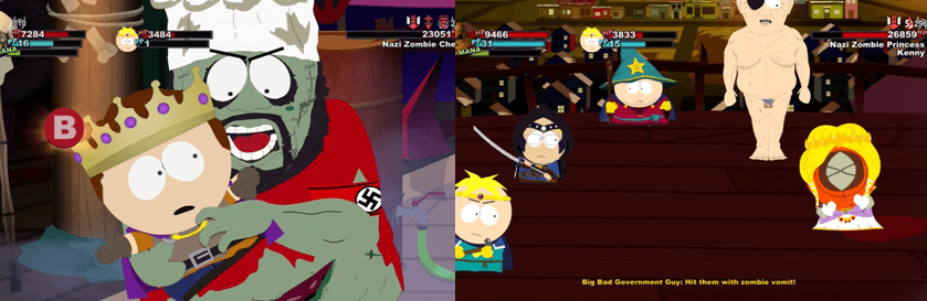 The game’s hilarious and multi-faceted story, which involves all the familiar faces of the show and even recycles or addresses jokes and loose ends from the episodes, is just as wacky and insane as the show has become over the years; what starts as a simple (yet surprisingly elaborate) war between Cartman’s human forces and those of Kyle’s elf-kind quickly escalates into a battle against Nazi zombies and gun-toting government agents looking to destroy the town. After both groups are betrayed by Clyde, the New Kid has to travel to Canada to translate a message; this is where the game’s presentation takes a sudden and hilarious left turn as Canada is rendered through traditional 8-bit graphics, complete with an 8-bit rendering of “Blame Canada” and the Canadian national anthem. It’s a hilarious and mental detour that, sadly, doesn’t last as long as it could do (though, thankfully, you can return to Canada to fight Dire Wolves whenever you want). Ultimately, all of the kids you’ve befriended lay siege to Clyde’s elaborate dark tower and you end up having to disarm a nuclear bomb inside of Mr. Slave’s ass, battle a zombified Chef, and finally defeat Kenny after he claims the Stick as his own and transforms into a Nazi zombie himself.