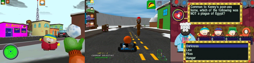 There’s so much to do around town thanks to the game’s side quests; you’ll be finding kindergarteners in a game of hide-and-seek, tracking down Mr. Hankey’s lost pooplings, ferrying messages between South Park characters, attacking Mongolian children on behalf or Mr. Kim, and you can even have surgery performed to look like David Hasselhoff! Jimbo and Ned send you on a side quest that sees you battling a number of option bosses as well, such as a rabid dog, the iconic mouse-penis, and the Canadian Barking Spider of the Queefing Caverns.
